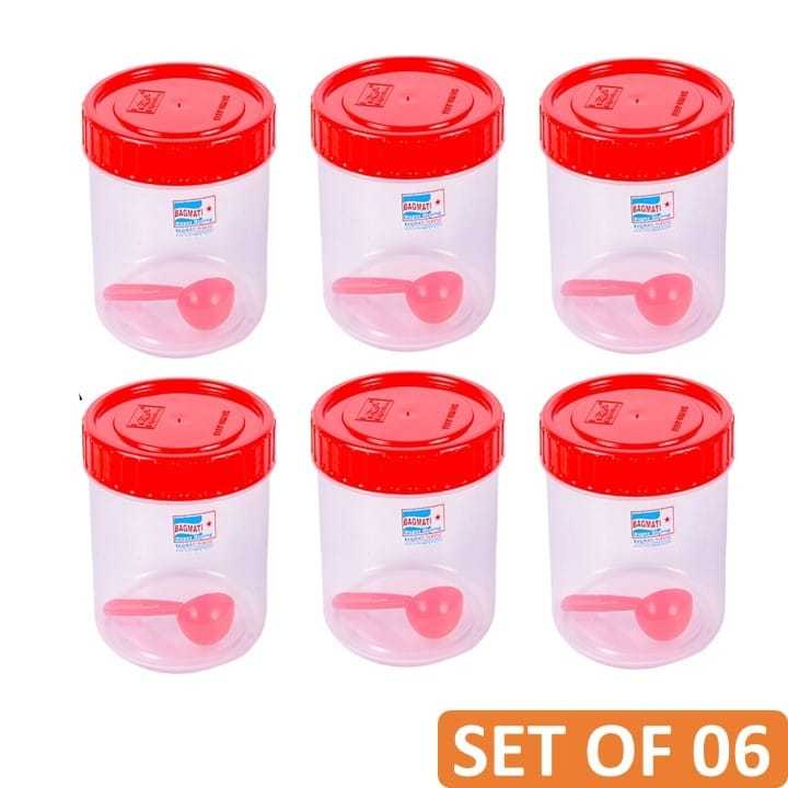 Round Transparent Plastic Utility Container With Spoon 500ML - Set Of 6 (Red)