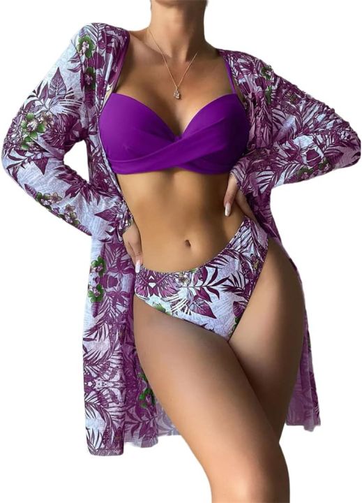 Swim Summer Beach Tropical Print Mesh Bikini Set Cross Wrap Push Up Bra Top 3 Pieces Bikini