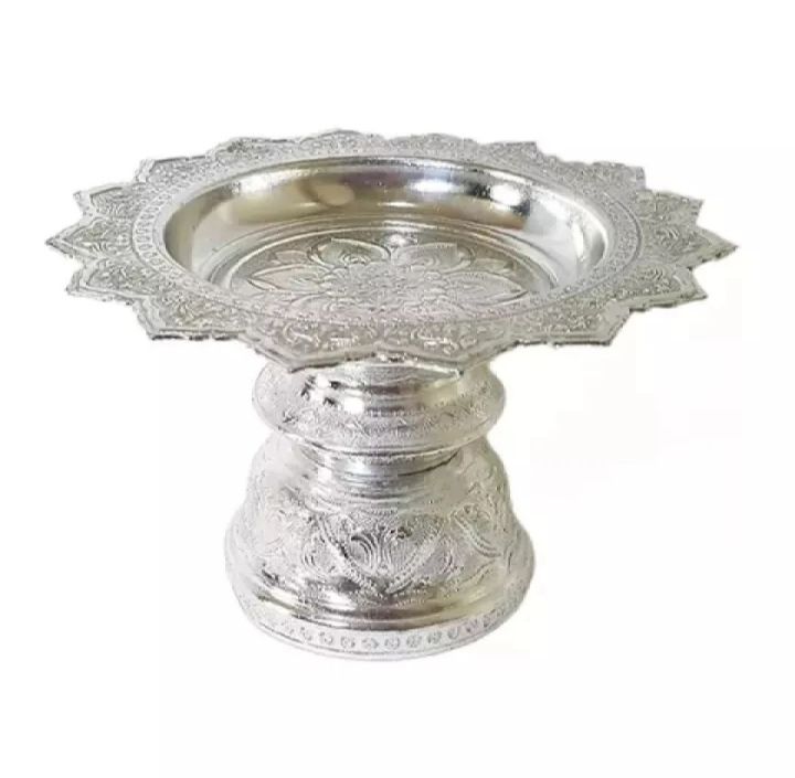 24 Cm. Thai Sliver Coated Aluminum Traditional Tray With Pedestal For Worship (Tika Thali)