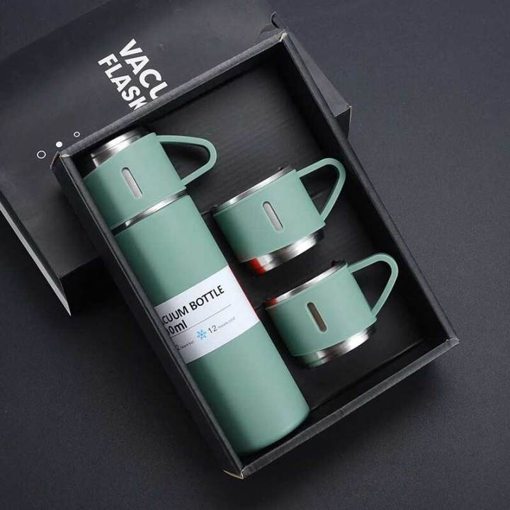 3 In 1 Vacuum Insulated Thermo Thermos Flasks Bottle 500ml With 3 Cups Gift Set
