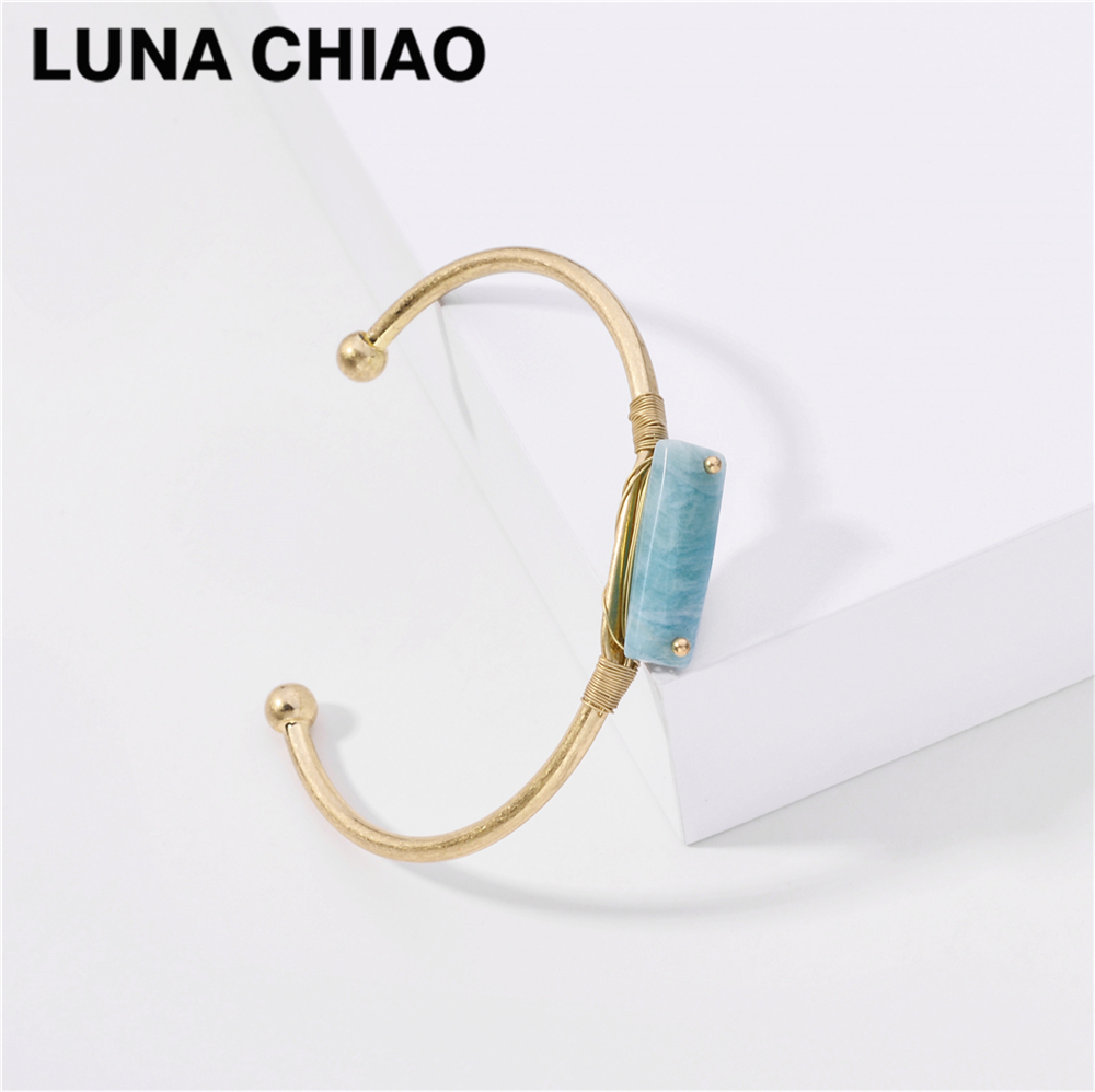 【3d41dddf】LUNA CHIAO Worn Gold Natural Stone Metal Bangle Bracelet for