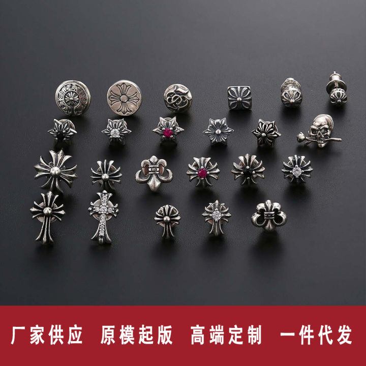 Trendy brand CH Croling old-fashioned vintage Thai silver with diamond cross flower Scout flower stud earrings collection of men and women 925 silver needles