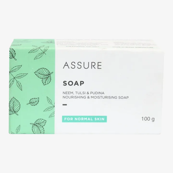 Assure%20Soap%20With%20Neem,%20Tulsi%20&%20Pudina,%20Nourishing%20&%20Moisturising%20Soap%20100g%20-%20Image%201