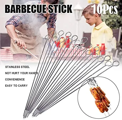 Barbecue Skewers ,10Pcs Stainless Steel Barbecue String with Wooden Handle BBQ Stick Needles
