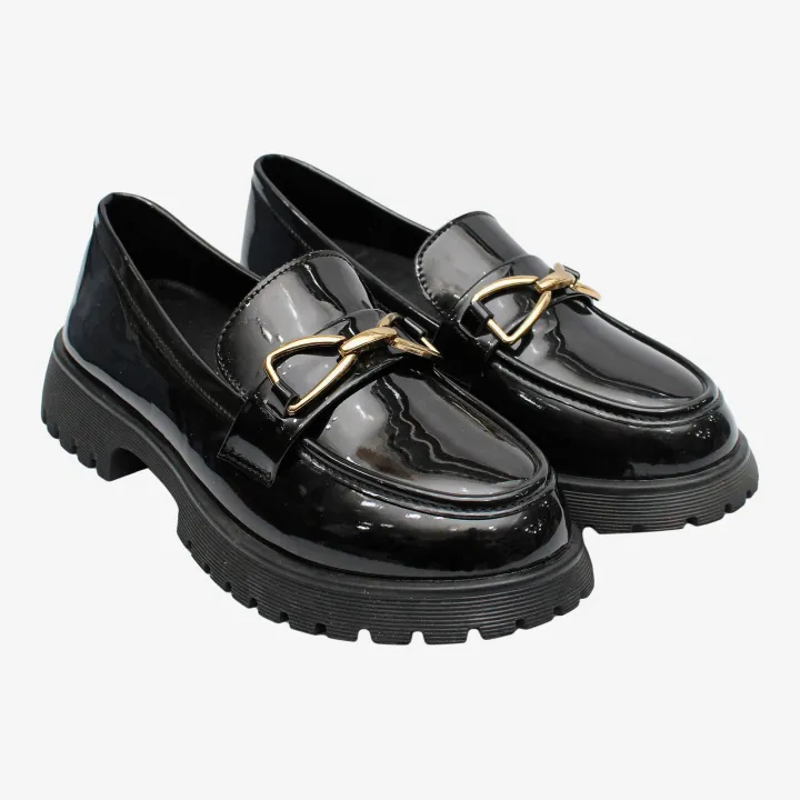 Black Color Buckle Design Shining Loafer Shoes For Women