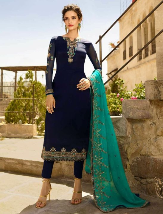 Blue Satin Georgette Ladies Unstitched Partywear Kurta Surwal Piece