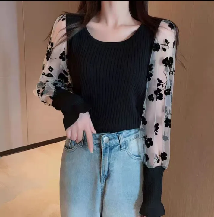 Casual%20Fashion%20Contrast%20Floral%20Full%20Sleeve%20Mesh%20Mock%20Neck%20Tee%20-%20Image%201