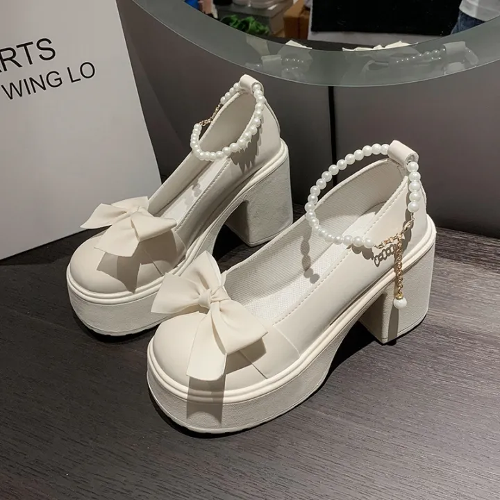 Chanel style Mary Jane shoes for women 2023 New Pearl bow JK single-layer shoes thick heel platform spring and autumn small leather shoes