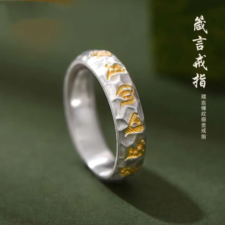 Chiba Taiyin Gold-Plated Six-Word Mantra for Men Women, Fashionable and Versatile National Style Hammered Adjustable Ring Gift