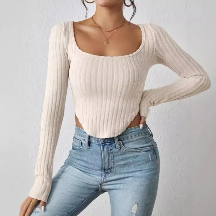 Cross-border Europe and the United States, Amazon AliExpress, 2024 autumn new square neck, long sleeves, irregular pit strip T-shirt women