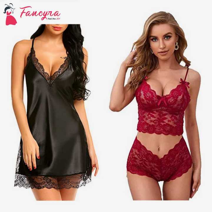 Fancyra Combo Set Of Stylish Babydoll Lingerie With G String Panty And Bra Panty Set Free Size Black And Maroon Color
