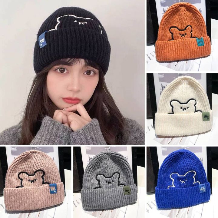 Fashion Winter Warm Knitted Cap Soft Thick Slouchy Bonnet Bear Embroidery Solid Color Leisure Cap for Men Women