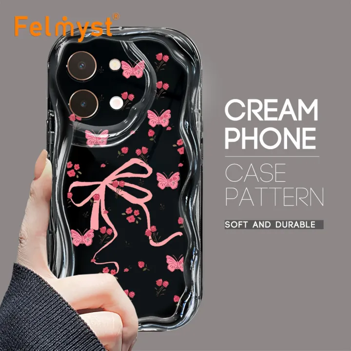 FELMYST for Vivo Y28 4G Back Cover Butterfly Pink Flower Cream Texture Wavy Edge Soft Silicone Phone Case