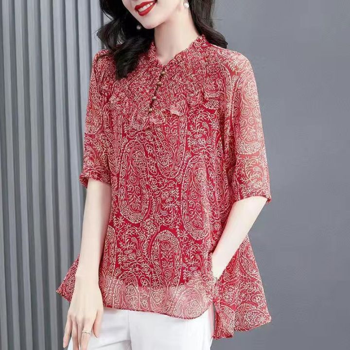 Floral Chiffon Shirt Female Short-sleeved Top Fashion Korean Style Elegant Lady Noble Shirt Blouse