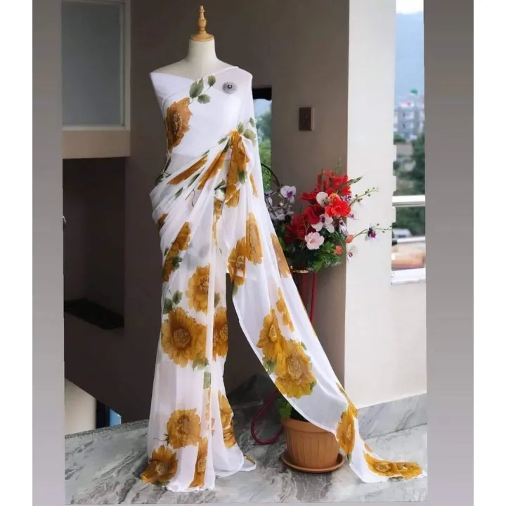 Flower Print Chiffon Saree For Women | White Brown Flower Printed Chiffon Saree For Women | Saree For Women