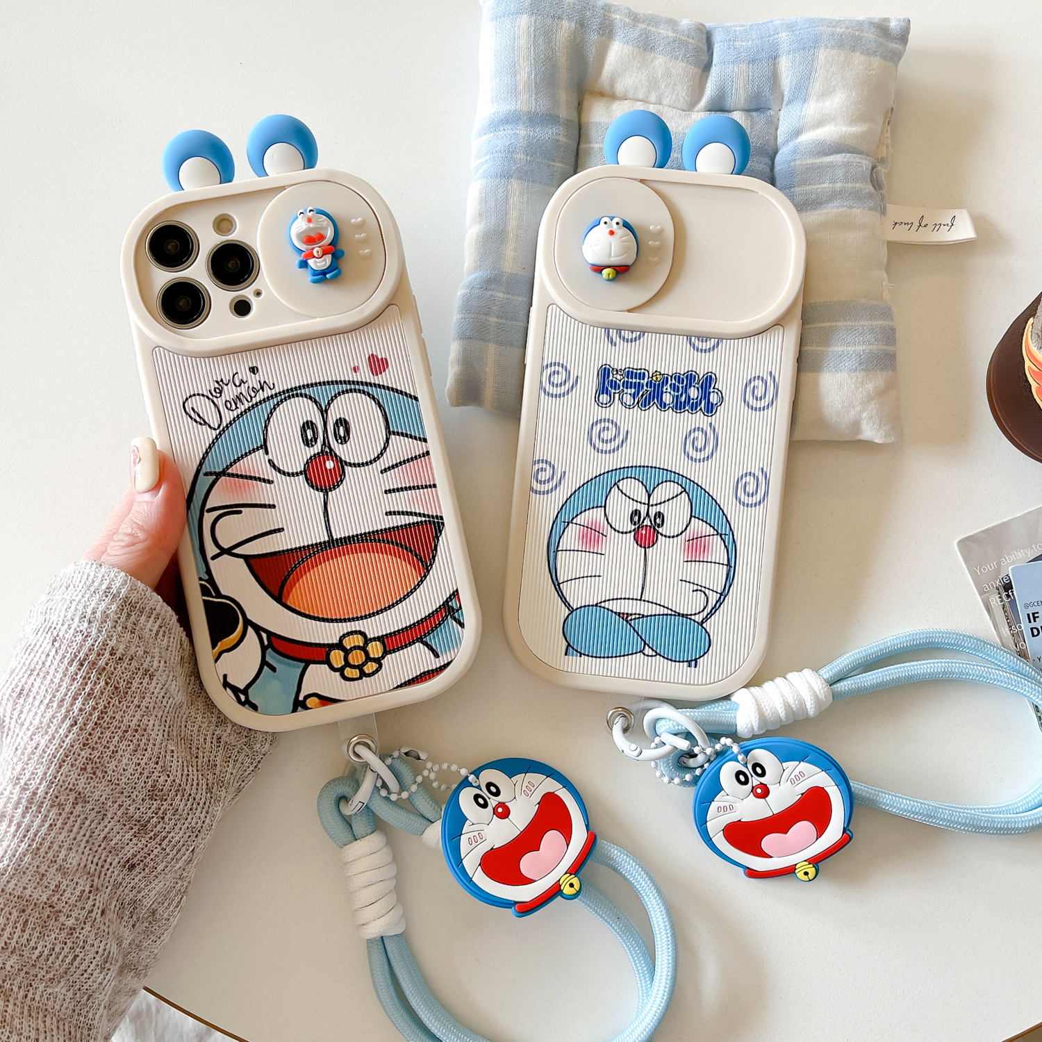 【Get One Free Bracelet】Sroof Case For iPhone 11 12 13 14 15 16 Pro Max New fun sliding window series three-dimensional big smile Doraemon Phone Case Back Cover