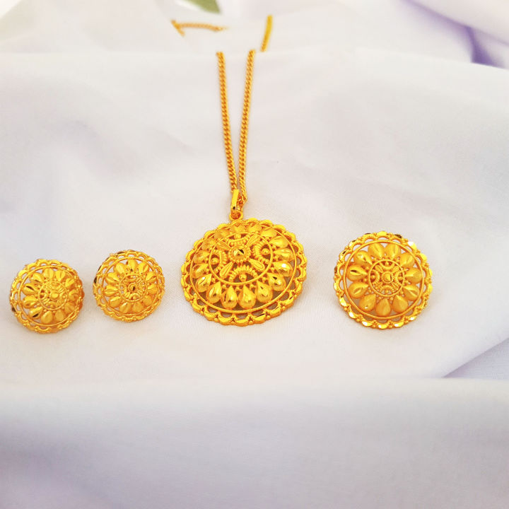Gold Plated Pendant With Chain ,Adjustable Ring & Top Earring Set | Locket With Chain Finger Ring & Top Authi Top With Free Size Ring & Pendant For Marriage Gold Design Ring Gold Polished Pendant Set For Bridal Aniversary Top With Ring Behuli Ring Top Set