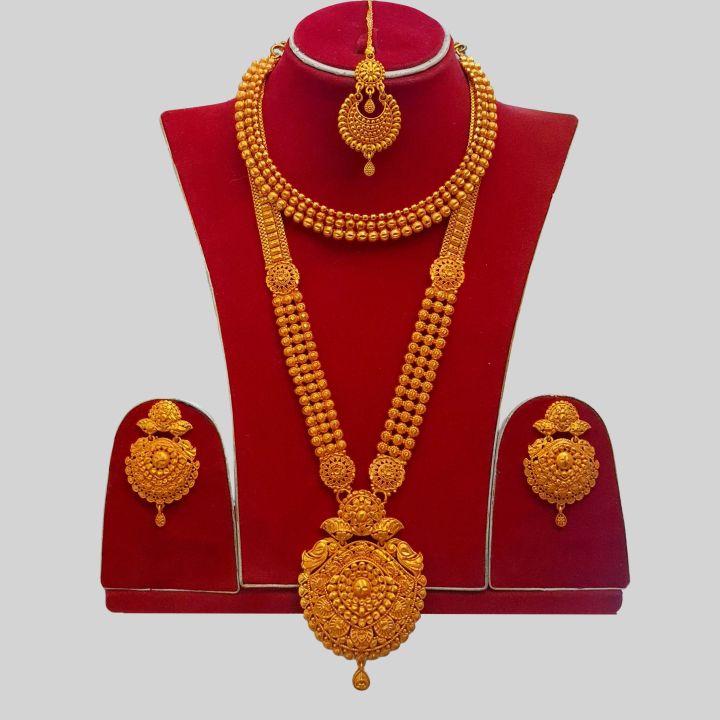 Gold Plated Rani Haar With Necklace,Earrings & Sirbindi Nepali Bridal Jewelry Rani Haar Combo Set Full Bridal Set Rani Haar For Bride Artificial Rani Haar Behuli Design Rani Haar Set Bridal Full Set Gold Polishedd Rai Haar Gold Design Ranihar For Marriage