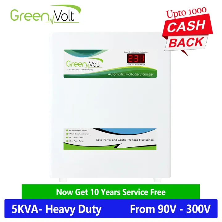Green Volt Digital Voltage Stabilizer 5 KVA, 90V-300V, 100% Copper (Bypass System and Mains MCB) For Main Line