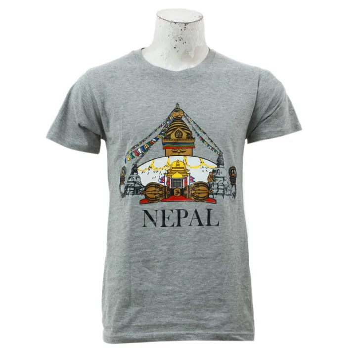 Grey Cotton Round Neck Buddha Nepal Printed T-Shirt For Men