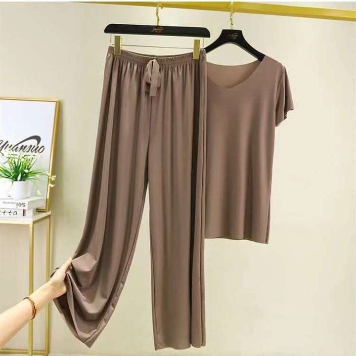 Ice%20Silk%20Pamas%20Women%20Summer%20Two-piece%20Set%20V-Neck%20Short%20sleeve%20T-shirt%20Thin%20Homewear%20loose%20Wide-Leg%20Pants%20-%20Image%201