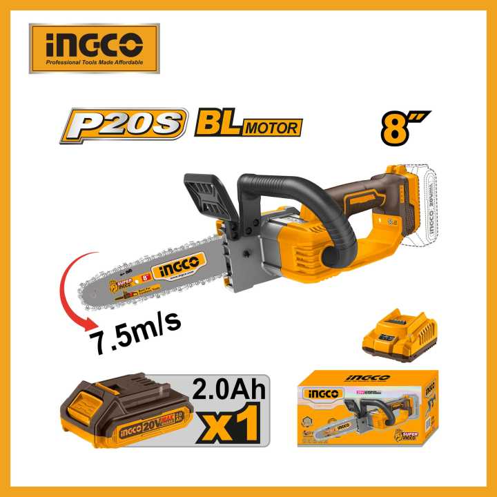 INGCO New 20V 8" Cordless Brushless Chain Saw with Lithium-Ion Battery Pack and Charger CGSLI20851