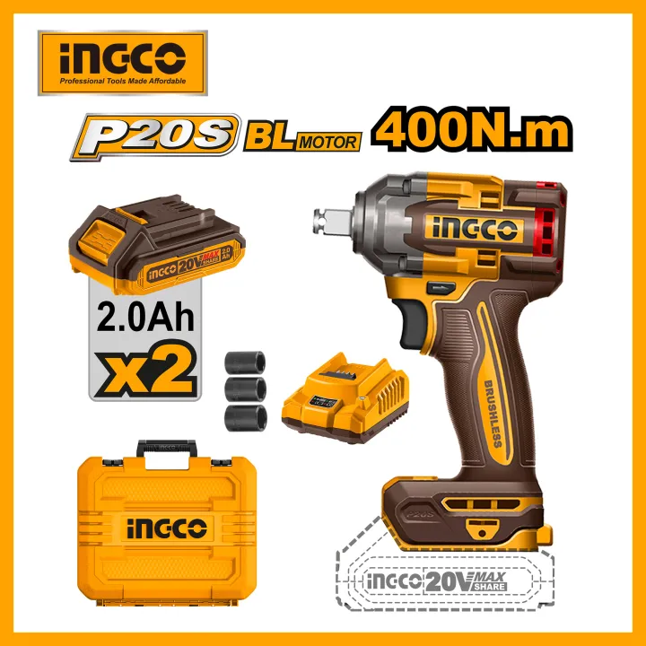 INGCO 20V Max Li-Ion Cordless Impact Wrench with 3-Speed Control and LED Light, 400Nm High Torque, 2.0Ah Batteries CIWLI2040