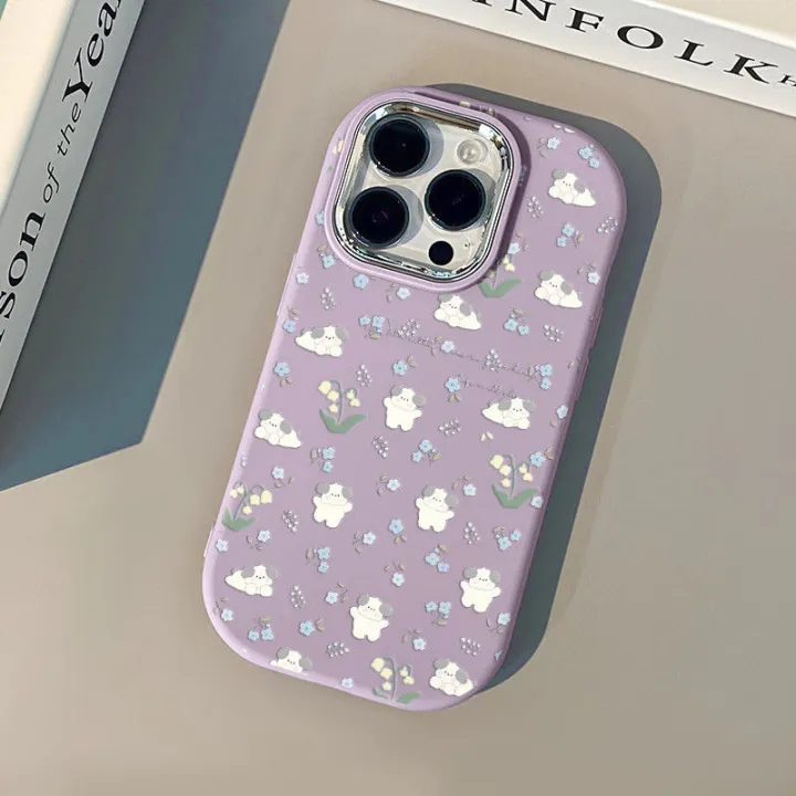 Little Fresh Blue Flower Puppy Graffiti Cover Compatible for IPhone 15 11 14 13 12 Pro Max 7Plus XR XS Max X 7 8 Plus SE Macron Plating Metal Lens Case