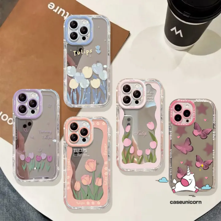 Luxury Mirror Make Up Cartoon Flowers Cute Tulips Casing Compatible for IPhone 16 15 12 14 11 13 Pro Max XR 7Plus XS Max X 8 7 15 Plus Romantic Picture Frame Butterfly Starry Sky Case