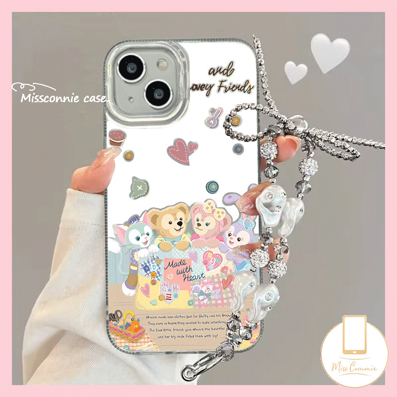 Luxury Ripple Luster Fashion Pearl Bracelet Case Compatible for IPhone 11 15 13 XR 14 12 Pro Max 7 15 7 Plus 8 14 Plus X XS Max SE 2020 Cartoon Linabell Stellaou Cute Bear Cover