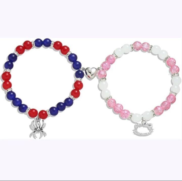 Masala Beads Spider And Kitty Charm Friendship Couple Lover Bracelet With Conjoined Two Heart Shaped Magnetic Stone Matching Magnet Bracelet
