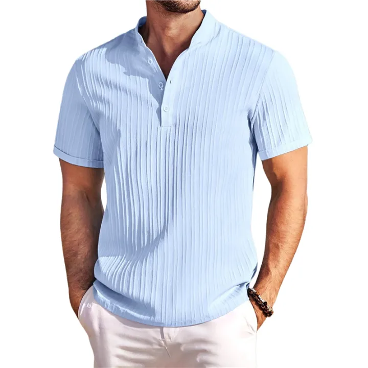 Men%20Casual%20Henley%20Tee%20Shirt%20Short%20Sleeve%20Band%20Collar%20Summer%20Beach%20Textured%20T-Shirt%20-%20Image%201