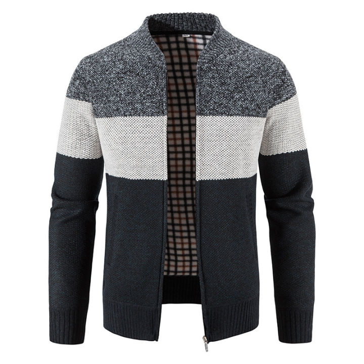 Men's sweater coat winter fleece-lined thick warm striped baseball collar sweater cardigan long sleeve outerwear sweater