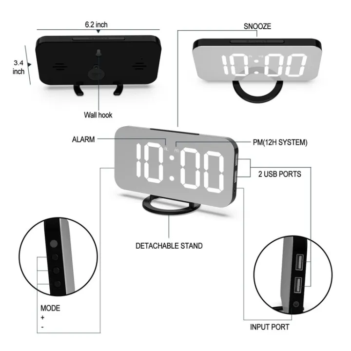 Mirror Digital Alarm Clock 12/24H 2 Time Display Modes LED Clocks