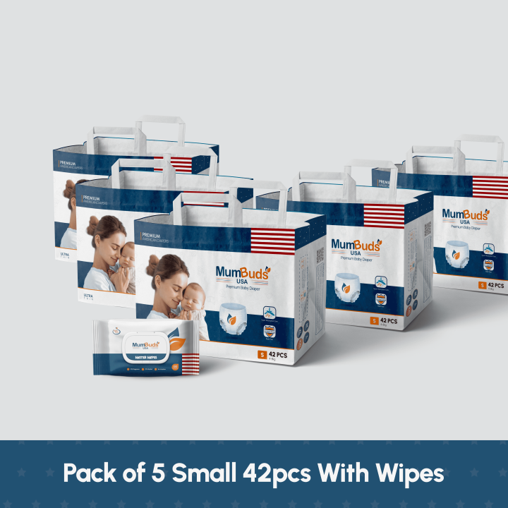 MumBuds American UltraThin Baby Diaper Small 42Pcs Pack of 5 with Wipes