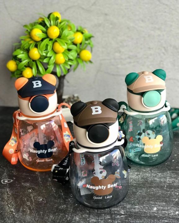 Naughty Bear Water Bottle 650ml Water Bottle with Straw and Strap Portable Cartoon Kids Water Bottle, Leakproof Cute Water Bottles for Kids