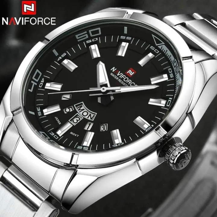 NAVIFORCE Nf9038 Day Date Function Analog Stainless Steel Strap Watch for Men - Black Dial with Silver Strap