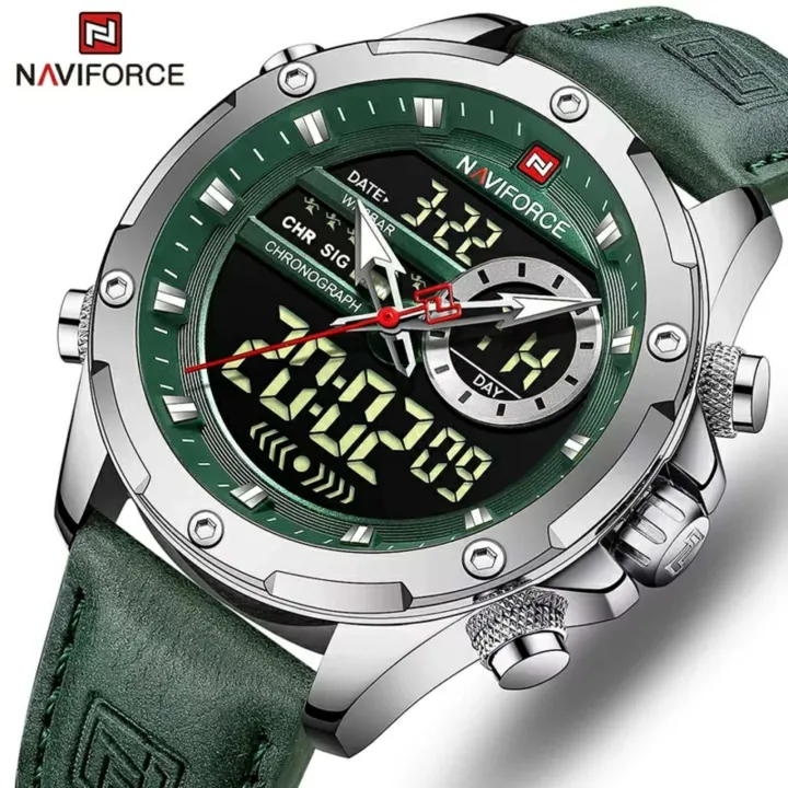 NaviForce%20NF9208%20Men's%20Dual%20Display%20LCD%20Leather%20Strap%20Complete%20Calendar%20Wristwatch%20-Silver/Green%20-%20Image%205