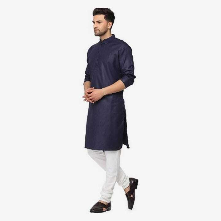 Navy Blue Solid Cotton Kurta Pajama Set For Men