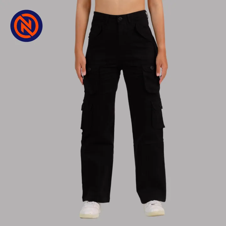 Nepster Black High Rise Premium Straight Cotton Cargo Box Pants For Women