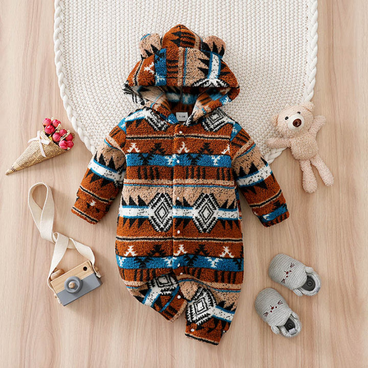 Newborn Baby Romper Winter Christmas 0-18 months Grid Ethnic Fair Isle Style Hooded with Ears Long Sleeve Newborn One Piece Suit