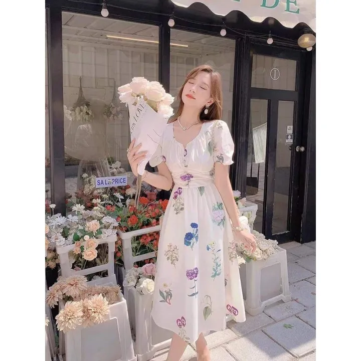 Off%20White%20Puff%20Short%20Sleeve%20Printed%20V-Neck%20Vintage%20Temperament%20Bohemian%20Floral%20Fairy%20Dress%20For%20Women%20-%20Image%201