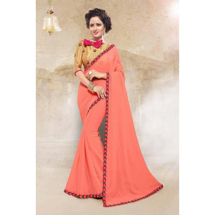Peach Chiffon Embroidery Border Saree With Blouse For Women