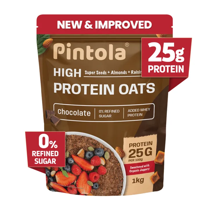 PINTOLA 25g High Protein Oats 1KG, Dark Chocolate,No Refined Sugar, with Almonds Raisin, Pumpkin and Chia Seeds, 8g Fibre, Rolled Oats, Breakfast Cereals