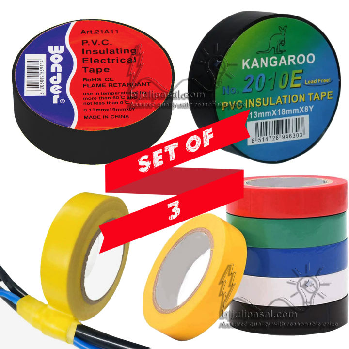 PVC Insulation Tape, High Adhesive Super Tensile Electrical Tape Set of 3Pcs Any Of 6 Colours:- Black, Red, Green, Blue, Yellow, White.