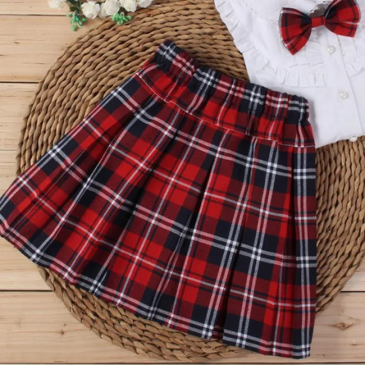 Red Plaid Skirt Girls Plaid Skirt Kids Short Sleeve Shirt Medium Big Kids Korean Pleated Skirt S04
