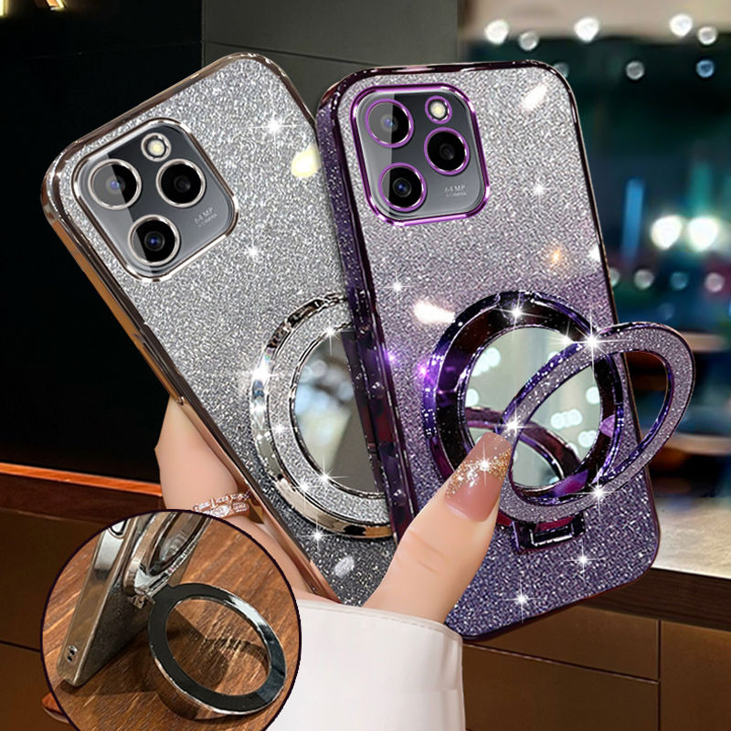 Sales promotion For Tecno Spark Go 1 / Go 2025 / Go 2024 / Go 2023 / Go 2022 / Go 2020 Back Cover with Makeup Mirror Holder Stand Luxury Shiny Gradient Plating Glitter Slim Phone Case Clear Soft Silicone Protective Cases Pouch Women Girls
