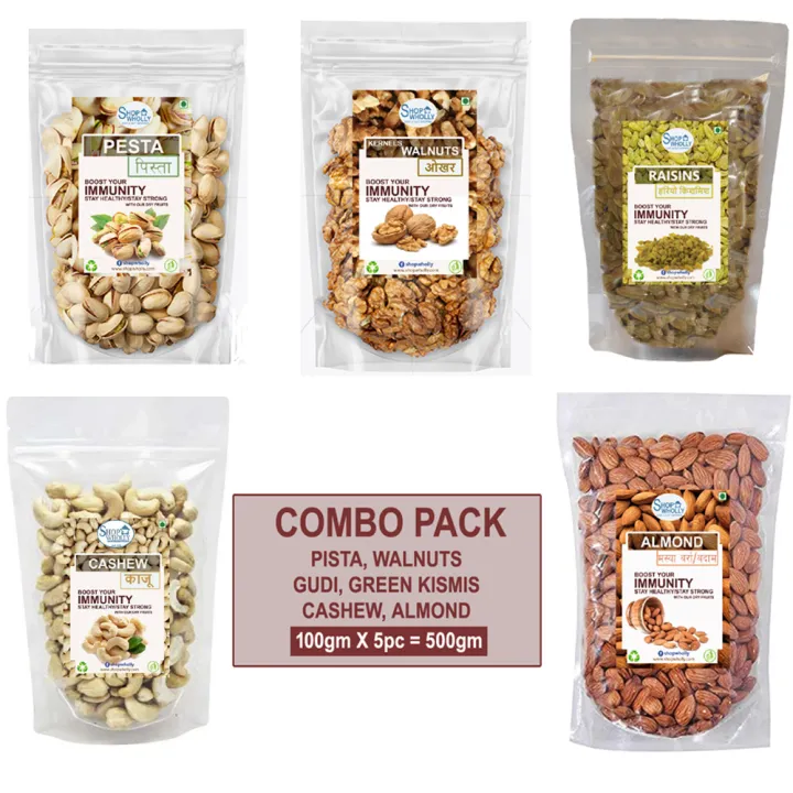 ShopWholly Premium Dry Fruits Combo Pack – Almonds, Cashews, Raisins, Walnuts (Gudi) & Pistachios – 100g x 5 / 200g x 5 / 500g x 5 / 1kg x 5