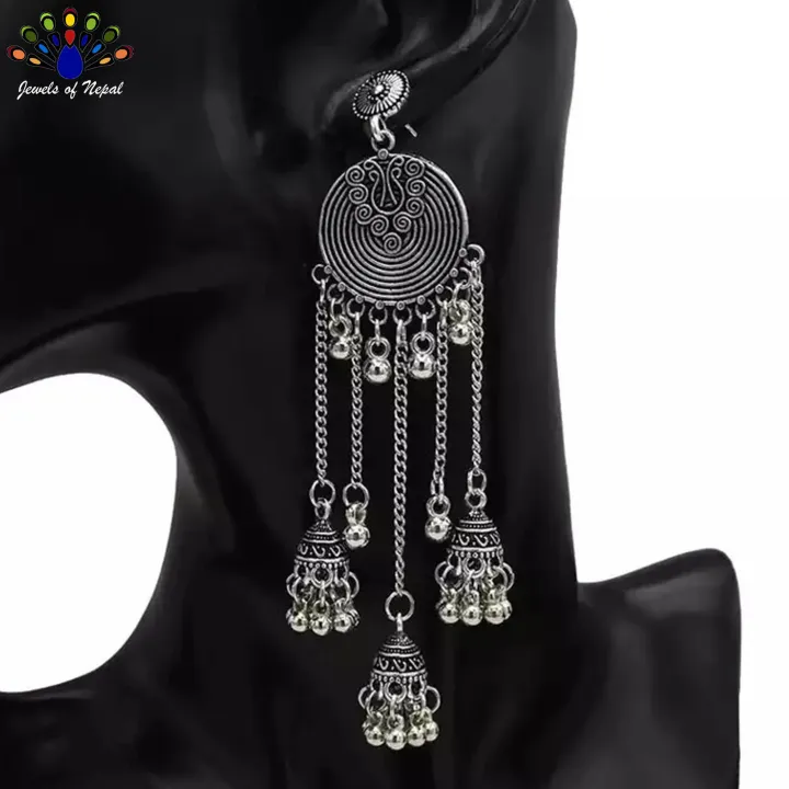 Silver%20Antique%20Toned%20Boho%20Chain%20Tasseled%20Bell%20Fall%20Jhumka%20Earrings%20-%20Jewels%20of%20Nepal%20-%20Image%201