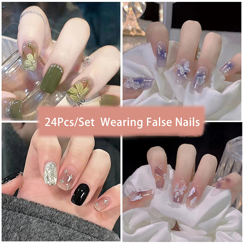 Simple Square False Nails Short French Fake Nails Press On Flowers Diamond Design Full Cover Nail Tips Manicure Tools Yao Store